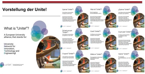 In der ersten Reflexionsaufgabe, in der die Seminarteilnehmenden über die Bedeutung und Auswirkungen der europäischen Hochschulallianz nachdachten, kamen sie zu der Erkenntnis, dass die Hochschulallianz Unite! trotz ihres großen Potenzials für das Studium den meisten Studierenden der TU Darmstadt wenig bekannt ist, da Informationen über die Allianz und deren Angebote wenig sichtbar sind. Ausgehend von dieser Idee führten die Teilnehmenden ein Projekt durch, bei dem sie einen Instagram-Kanal erstellten und Beiträge über die Unite! im Feed sowie in den Stories hochluden. Dabei hatten sie das Ziel, andere Studierende über die Unite! zu informieren und sie dazu zu motivieren, sich mit Mehrsprachigkeit und Sprachenpolitik in Europa auseinanderzusetzen. Dazu bezogen sie auch weitere Themen des Seminars wie Sprachenpolitik an Universitäten, die Rolle von Englisch und interkulturelle Zusammenarbeit mit ein.